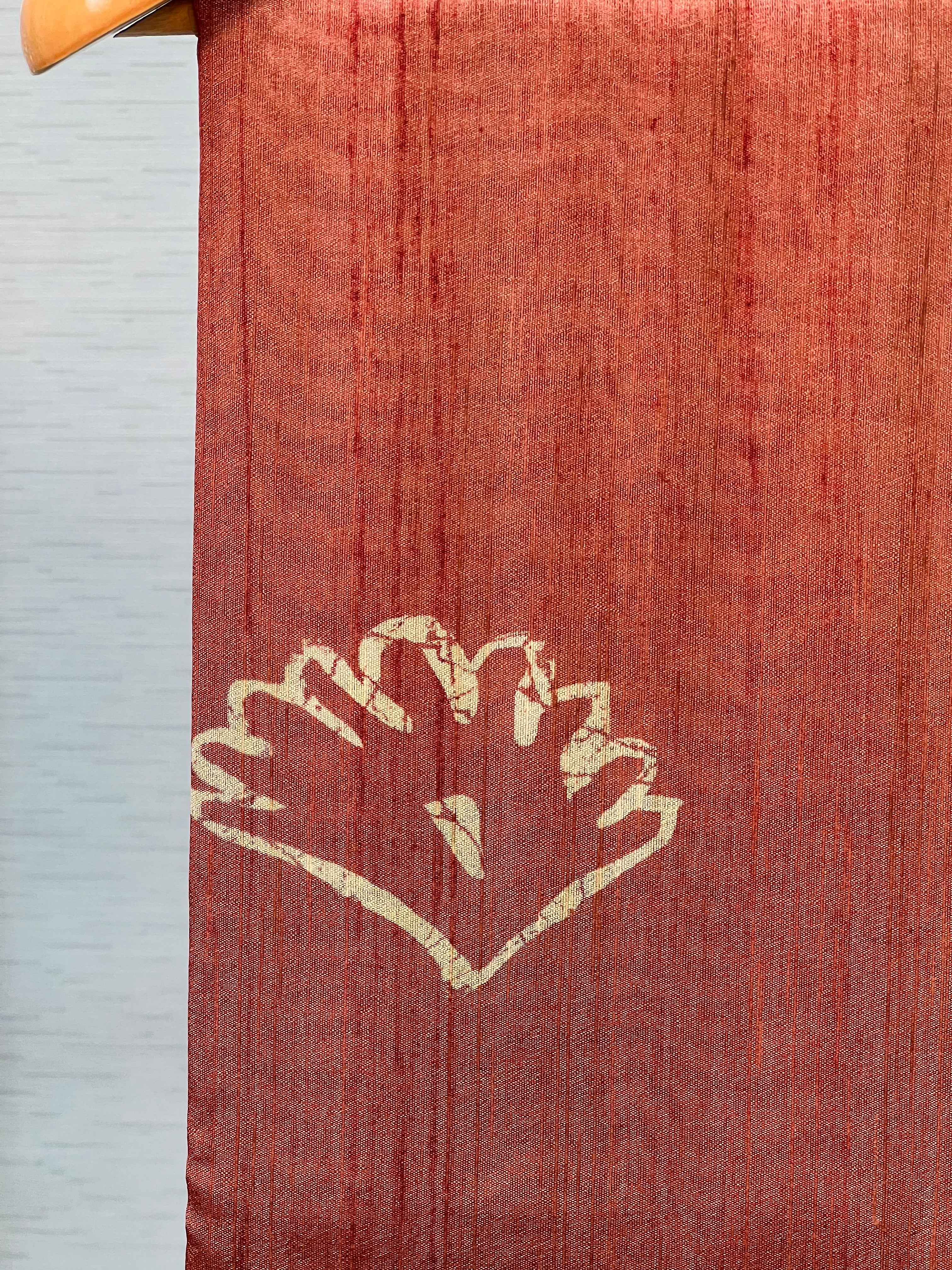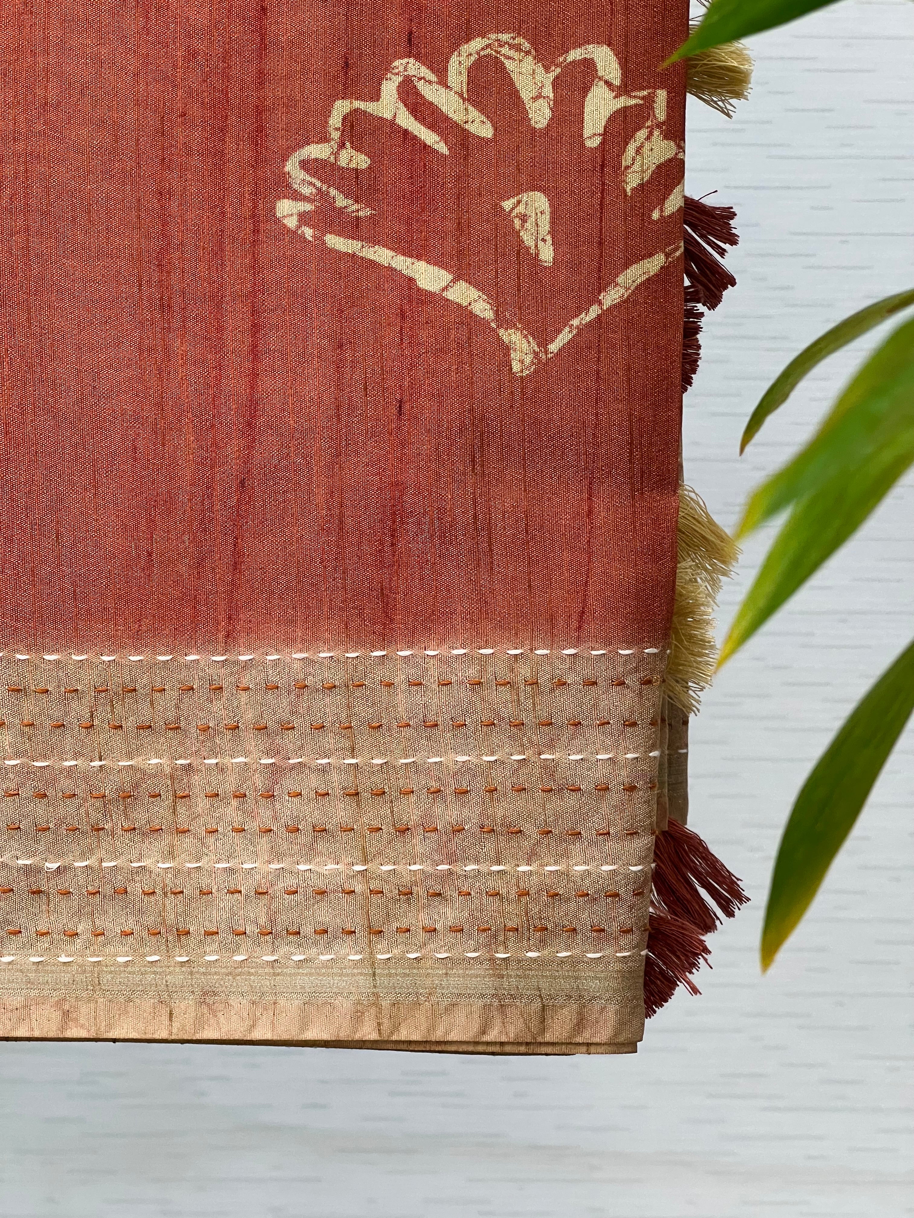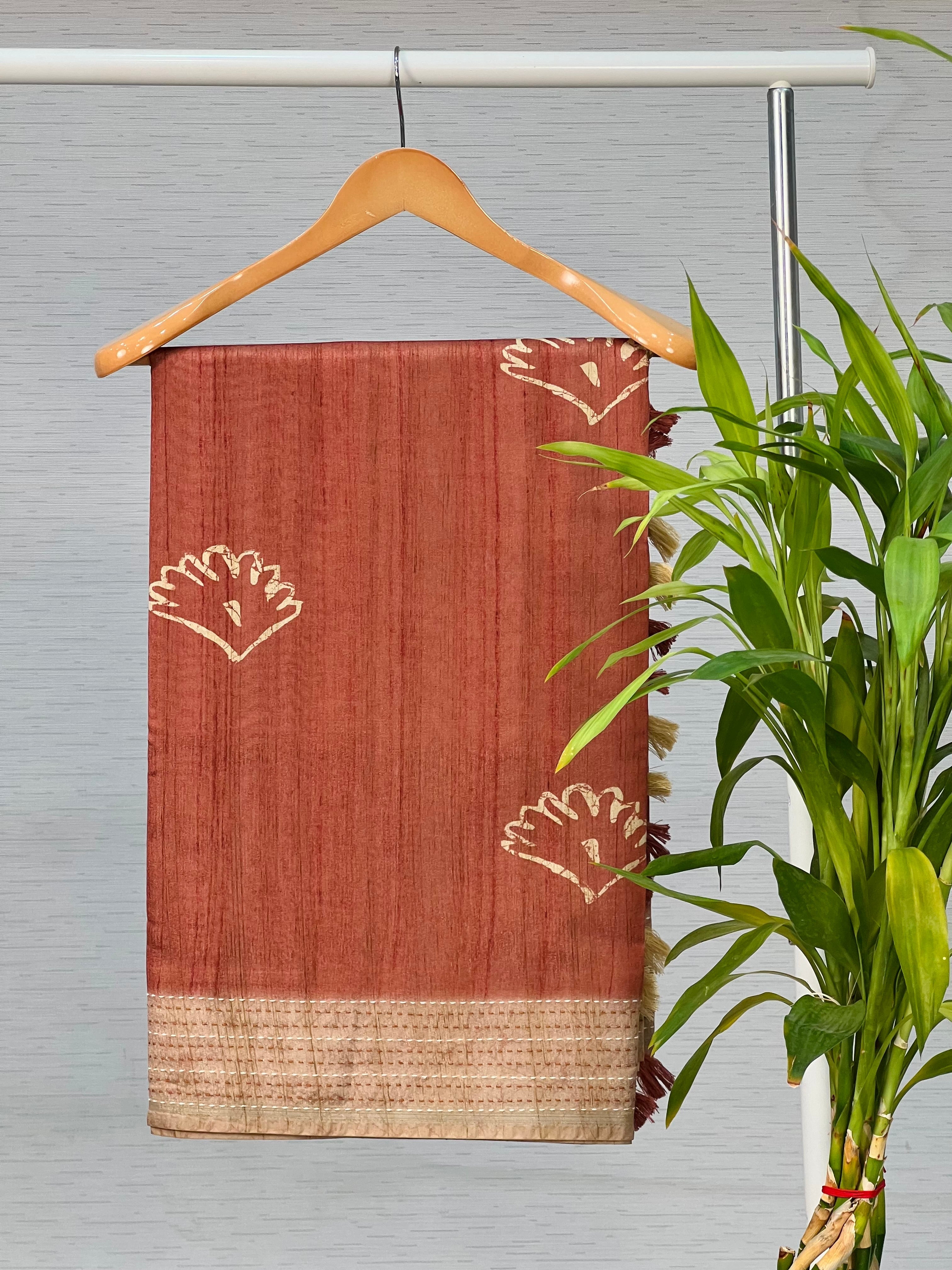 Description : Handloom weaved semi tussar block style printed saree with kantha stitch border. Same kantha stitch embroidery have been carried forward in pallu as well which looks very elegant.