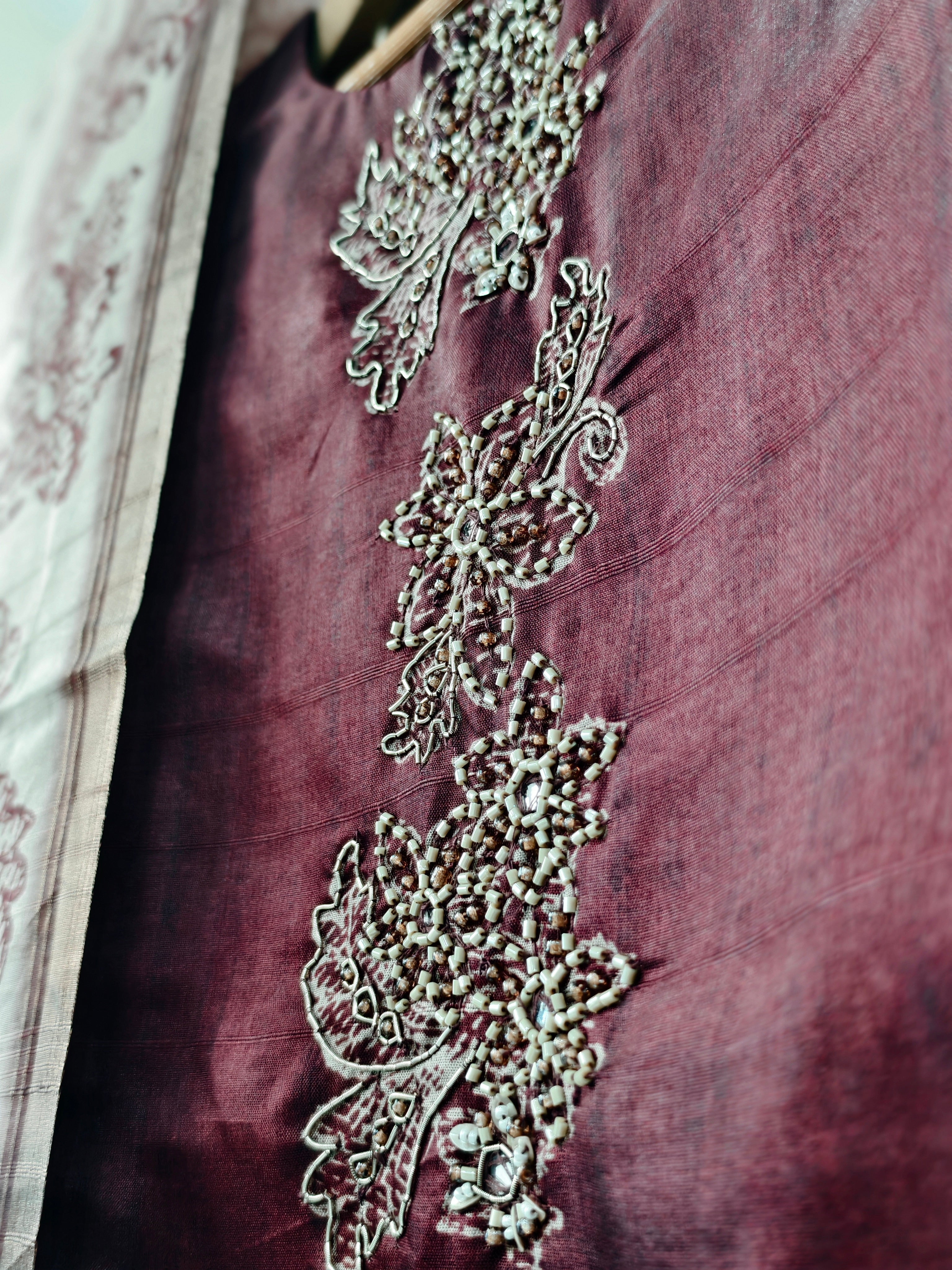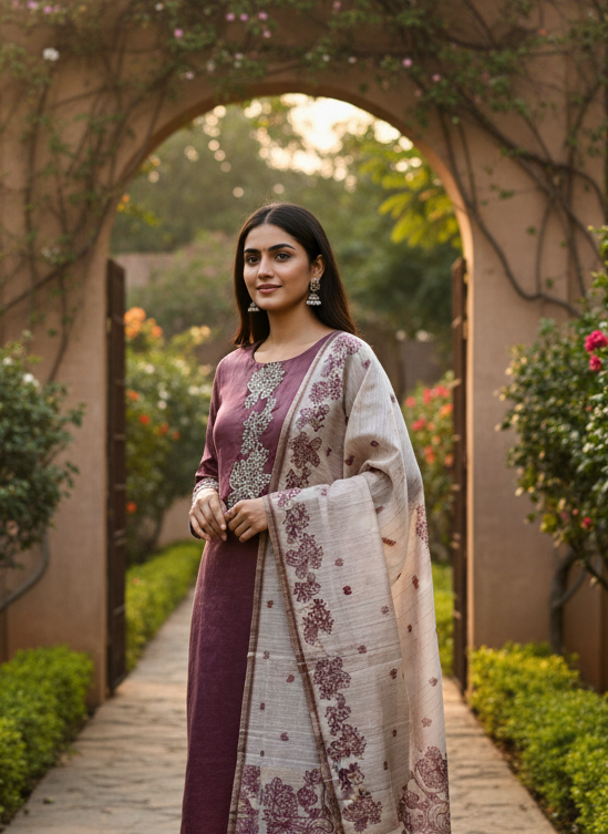 Experience the elegance of fine craftsmanship with this pure silk kurta set for women, designed to exude sophistication and comfort. Meticulously tailored from premium cotton-silk fabric, the rich red kurta is adorned with delicate woven buttis, adding a subtle yet refined texture. The distinctive neckline enhances its graceful appeal, while the chickoo-colored bottom and dupatta create a harmonious contrast, making this ensemble perfect for festive gatherings and formal occasions. Elevate your wardrobe with this red silk kurta set, where tradition meets contemporary style.