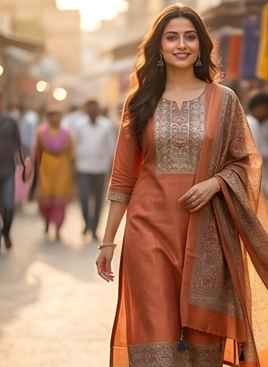 Celebrate earthy elegance with this burnt terracotta Pure Viscose Kurta Set, inspired by warm, sun-baked tones and traditional craftsmanship. The rich terracotta shade adds depth and character, making this ensemble a beautiful choice for festive gatherings, cultural occasions, and graceful daywear.
