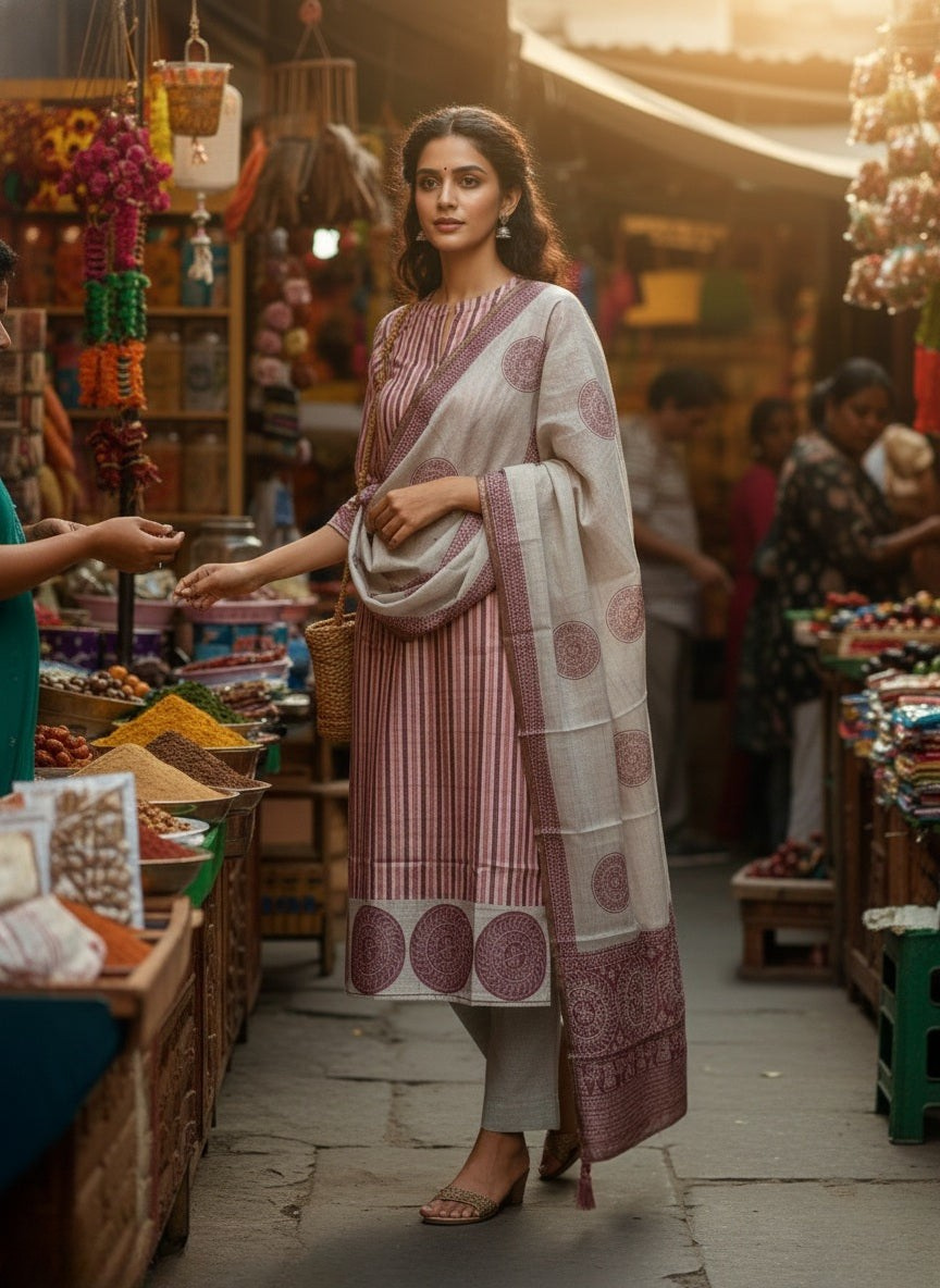 Beige and Rust Striped Semi Formal Ready to Wear Silk Kurta Set