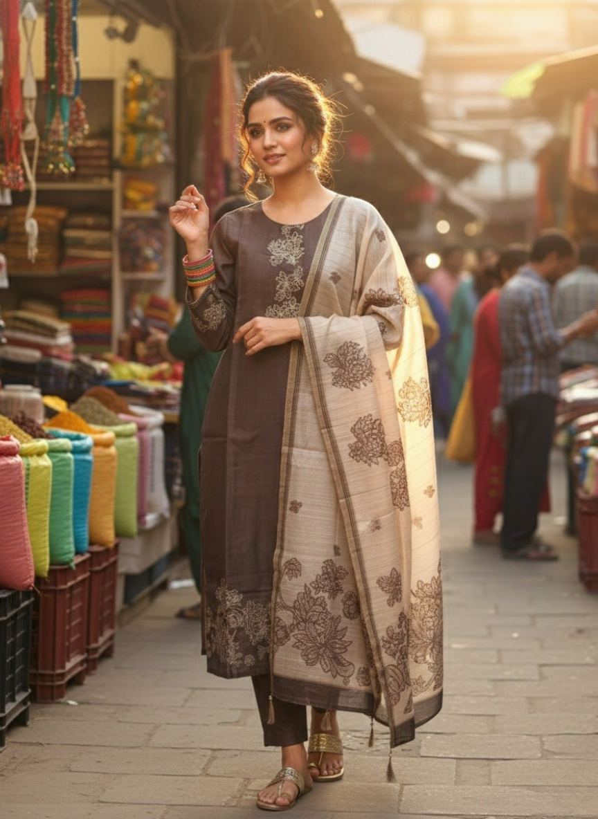 Experience the elegance of fine craftsmanship with this pure silk kurta set for women, designed to exude sophistication and comfort. Meticulously tailored from premium cotton-silk fabric, the rich red kurta is adorned with delicate woven buttis, adding a subtle yet refined texture. The distinctive neckline enhances its graceful appeal, while the chickoo-colored bottom and dupatta create a harmonious contrast, making this ensemble perfect for festive gatherings and formal occasions. Elevate your wardrobe with this red silk kurta set, where tradition meets contemporary style.