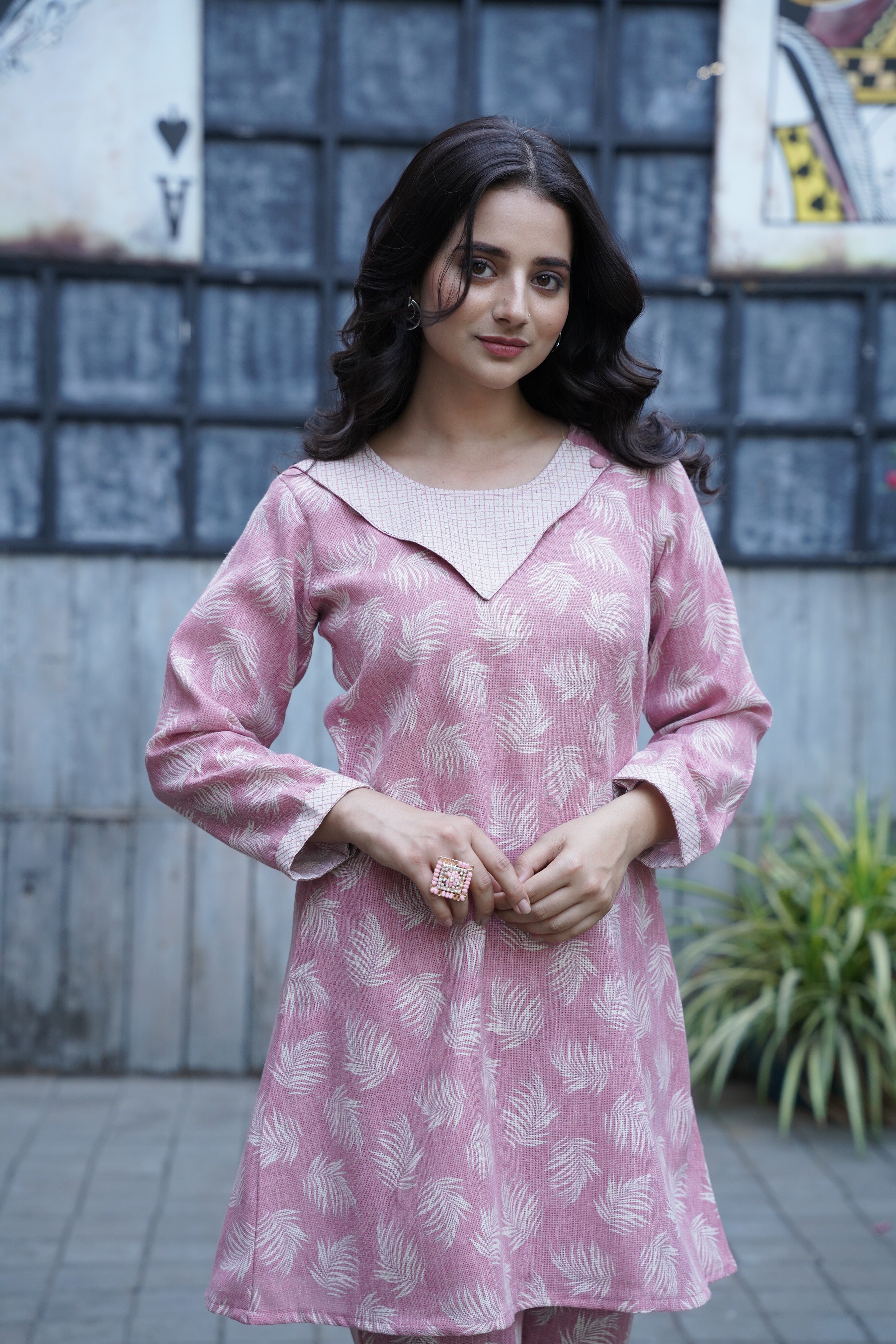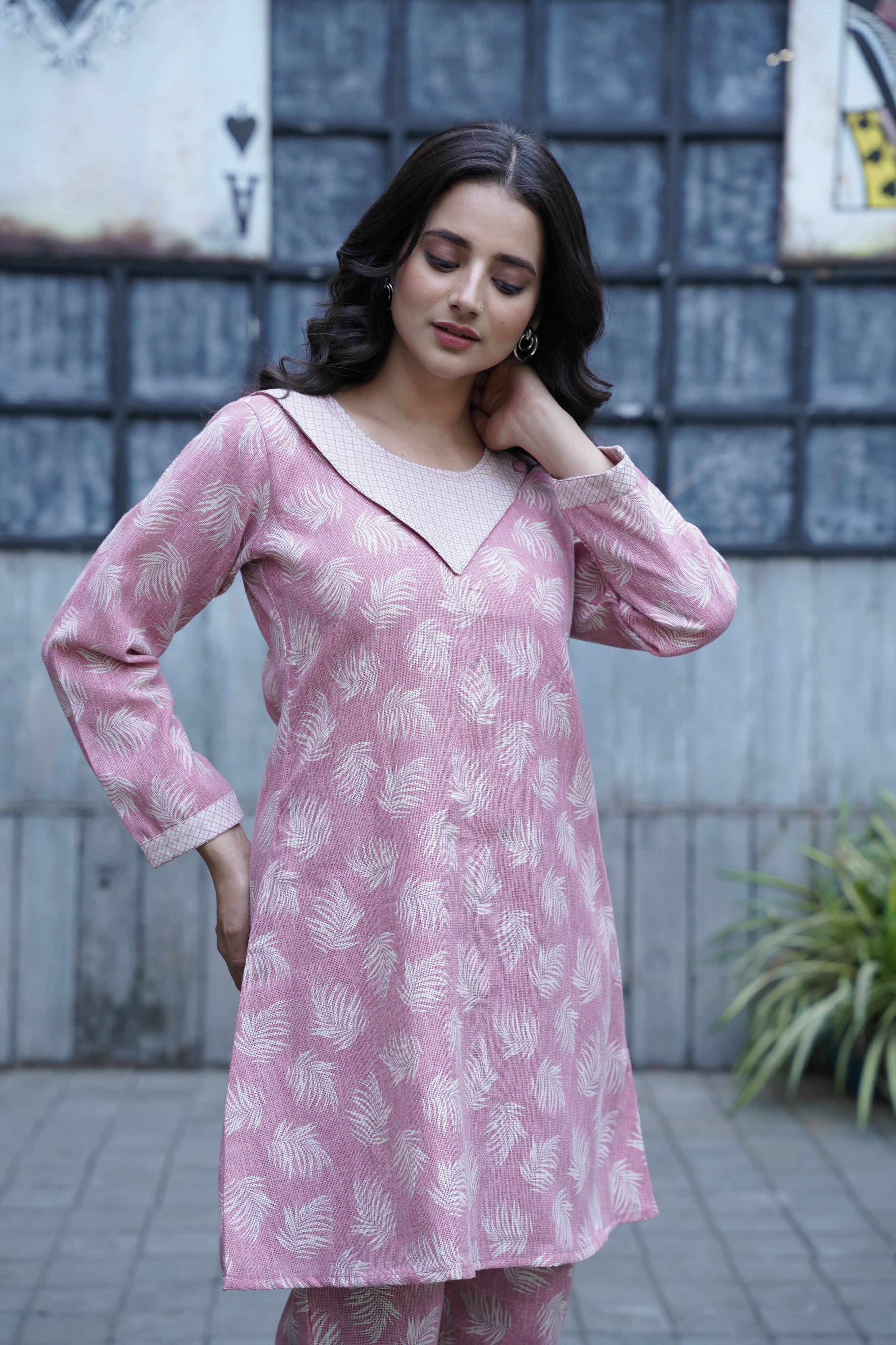 Refresh your wardrobe with this Stylish Pink Premium Linen Co-ord Set, designed to blend elegance with ease. Featuring a delicate feather print on a soft pink base, this set includes a straight-fit kurti with a unique V-collar detailing and perfectly coordinated trousers. The breathable linen fabric ensures all-day comfort while keeping your style effortlessly on point.